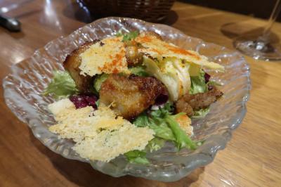 ●自家製ベーコンのシーザーサラダ 自家製ベーコンはパプリカパウダーをまぶしたもので伺うとバスク地方の作り方だそう。レタスにエスニック風のドレッシング、ベーコンの旨味、焼いたチーズのサクサク感が楽しい。