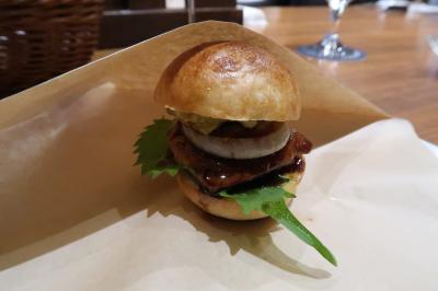 ●フォアグラバーガー 小さなバンズにフォアグラ、アボカドディップ、ペコロスのスライスを挟んだバーガー。口の中でそれぞれが合わさり旨味の相乗効果でより一層旨い。濃厚な味わいに大葉で後口も爽やか。名物と言われているのも納得。