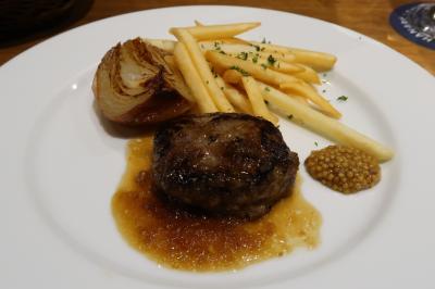 ●ハンバーグステーキ ポテトフライ、ローストオニオンがセット。焼き方としてはウェルダンのハンバーグで、和牛の凝縮された旨味が存分に味わえます。長時間ローストした玉葱の甘み、カリッカリのポテトフライもいいですね。