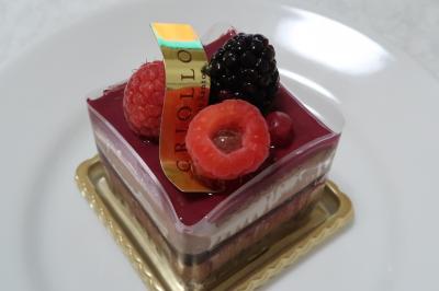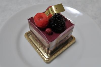 ●ニルヴァナ 見た目と「1000年先まで残したいスイーツ」というポップに引かれました。ベリー3種がトッピングされ、ショコラスポンジ、ブラックベリーショコラムース、ブラックベリージュレの三層。ムースは高級感を感じるなめらかな舌ざわりで濃厚。そこにジュレの甘酢っぱさ、スポンジの食感などが合わさり美味しい。トッピングされたベリーのフレッシュな風味で口の中がリセットできるので、くどさを感じず頂けました。