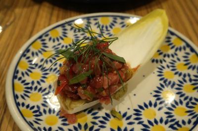 ●マグロのタルタル アンディーブのお皿で 所謂タルタルよりマグロの身はしっかり食感があり、刺身とは違った旨味を感じます。メニューに「プレザオラ」と書かれていたので少し塩漬けしているからでしょうか。下に敷かれた焼き茄子ペーストと合わせると変化もあり楽しい。