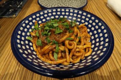 ●イカキモのラグー極太麺 麺は浅草開花楼と共同開発したものだそう。極太で一見するとうどんのような太さ。噛むと押し返すようなもちもちした弾力。それにイカキモと赤ワインの旨味が凝縮されたコクのあるソースが良く絡み旨い。イカの身は少なめでしたが、いつまでも食べていたい味です。