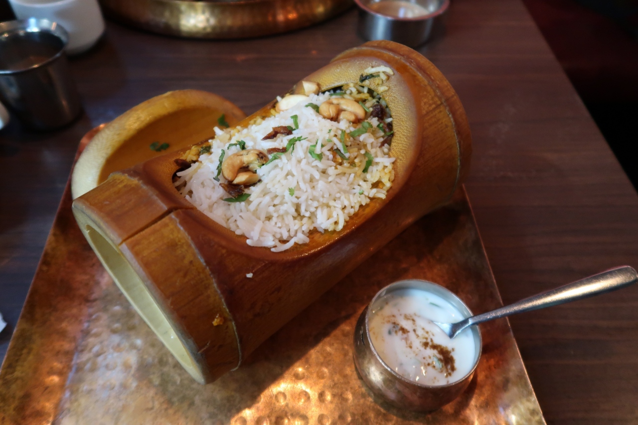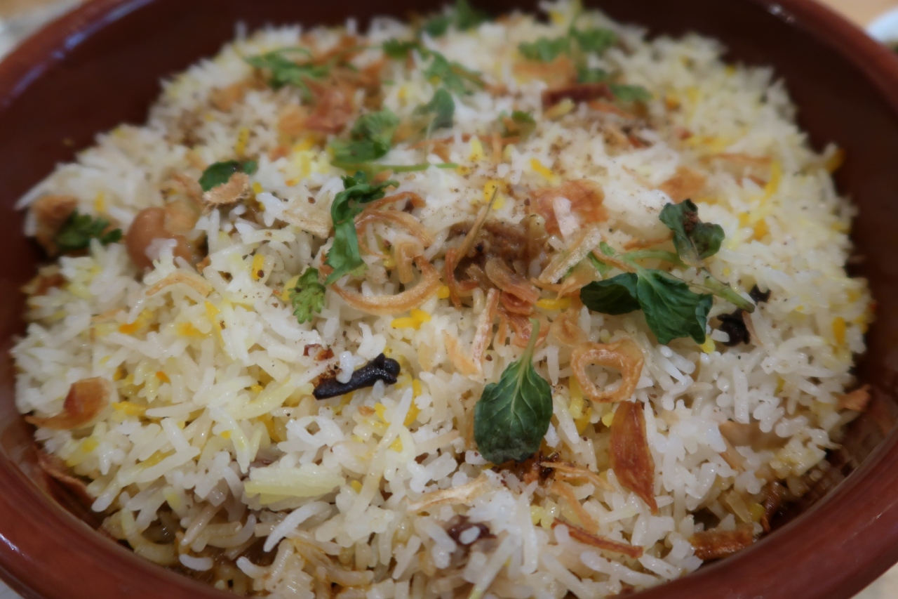カジキマグロのビリヤニは炊き上げた竹のまま提供されます。持ち上げて逆さにしてフリフリし、中のビリヤニを皿へ。このひと手間でいい香りが立ち昇り楽しい。スパイスは控えめで辛味はなく、ベースに八角やカルダモンの香り漂います。カジキマグロは大きめの切り身が4切れ。魚の出汁が米にしっかり出ていてこれは絶品でした。今までに食べたビリヤニはもっとスパイスが前に出ていましたが、これは魚の旨味がしっかり出ているので日本人に合う食べやすいビリヤニだと思います。