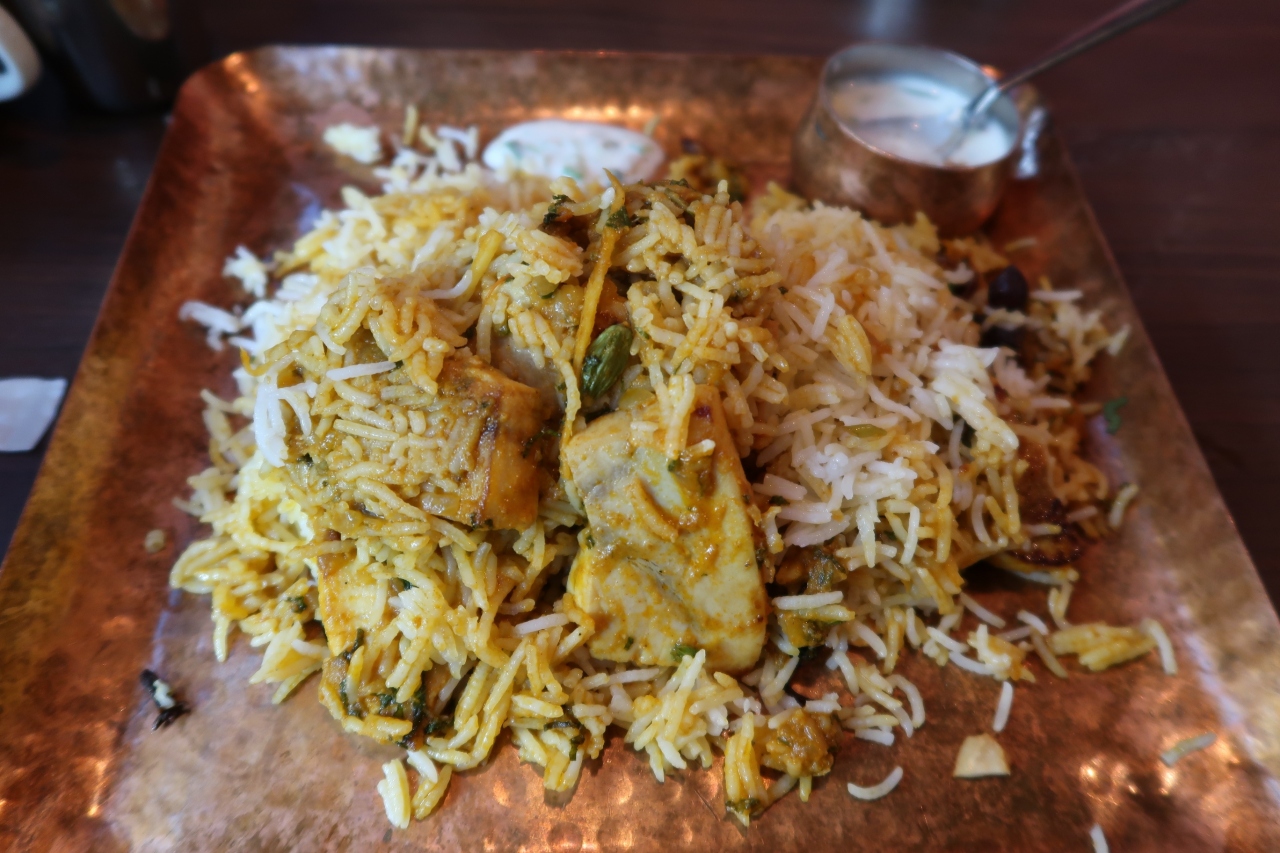 ●チキンビリヤニ すごいボリュームで皿に盛り付けたのは2/3ほど。しかも大きめの骨付き肉がゴロゴロ。その肉の旨味が全体に染み渡っています。そして非常にスパイシーでじんわり辛味も感じます。ついつい早く口に運びたくなるような旨さでした。セットのタイルパチャディ(ヨーグルト)をかけると酸味が加わり、味変も楽しめました。