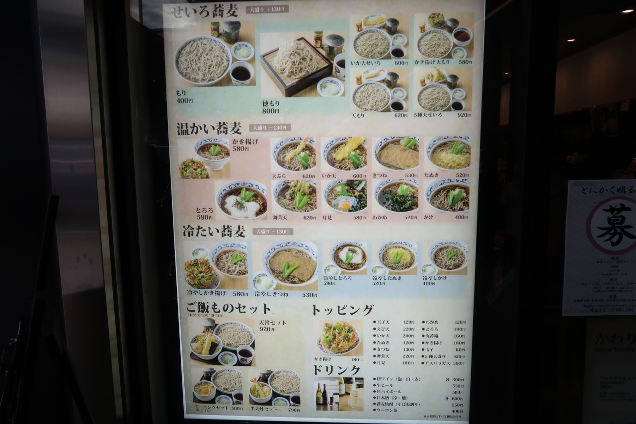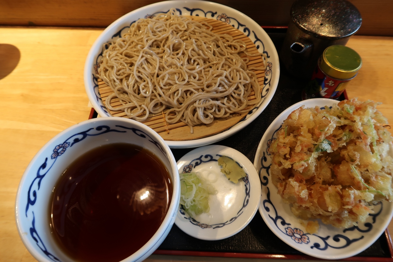 店頭表示では北海道産キタワセソバ十割という事ですが、機械での押し出し式。なので非常にリーズナブル。蕎麦は細めで想像していたよりはコシもありました。ただエッジがたっていない分、食感や喉ごしには少々物足りなさは感じます。手打ちそばと駅そばの中間ぐらいと言えばいいでしょうか。値段を考えれば妥当な味わいだと思います。かき揚げ天は桜海老、長葱など。注文してから揚げているのでアツアツ。衣は軽い食感ですが、油っこく口に残り今いちでした。ただリーズナブルで簡単に済まそうという点では候補になる店だと思います。- 旅行時期
