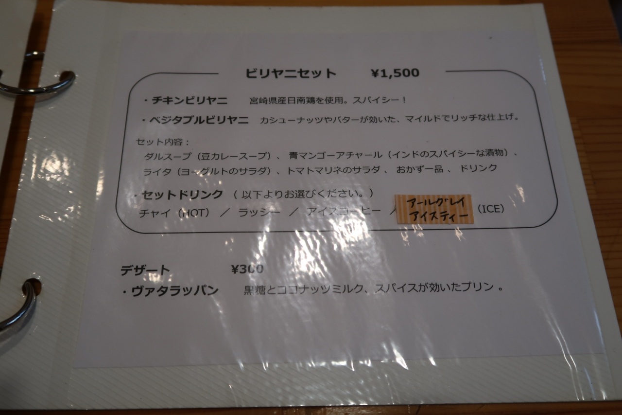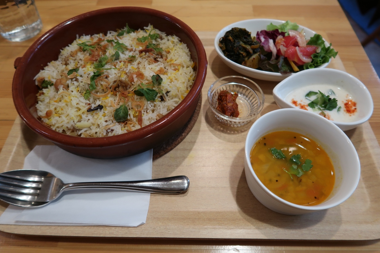 平日ランチで訪問。13時前で先客1組。小洒落た店内でテーブル3席とカウンターという可愛らしいお店です。テーブル席に案内され、注文したのはチキンビリヤニセット。注文を受けてから炊き上げるので、15分ほど待ち提供されました。