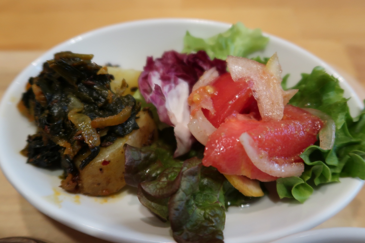 ●おかず(じゃがいもクミン炒め・ほうれん草スパイス炒め・サラダ) サラダに使われているのは広島産レモン。皮ごと食べられフレッシュ感のある酸味がいい。