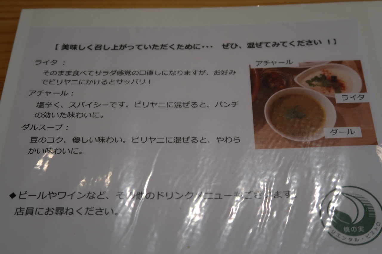 パラパラ系のビリヤニが好きな方にはお勧めできませんが、中々美味しいビリヤニでした。壁に掛かれた夜のメニューを見ると、ビストロのよう。これはディナータイムも良さそうです。- 旅行時期