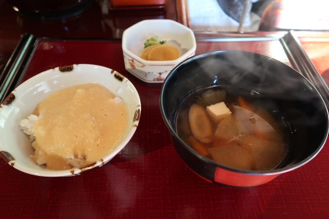●麦とろご飯 香物 けんちん汁 けんちん汁の野菜は下茹でされているのか、雑味がなく美味しいお出汁で癒されます。麦とろも間違いなく、お腹は一杯でしたが頑張って食べきりました。