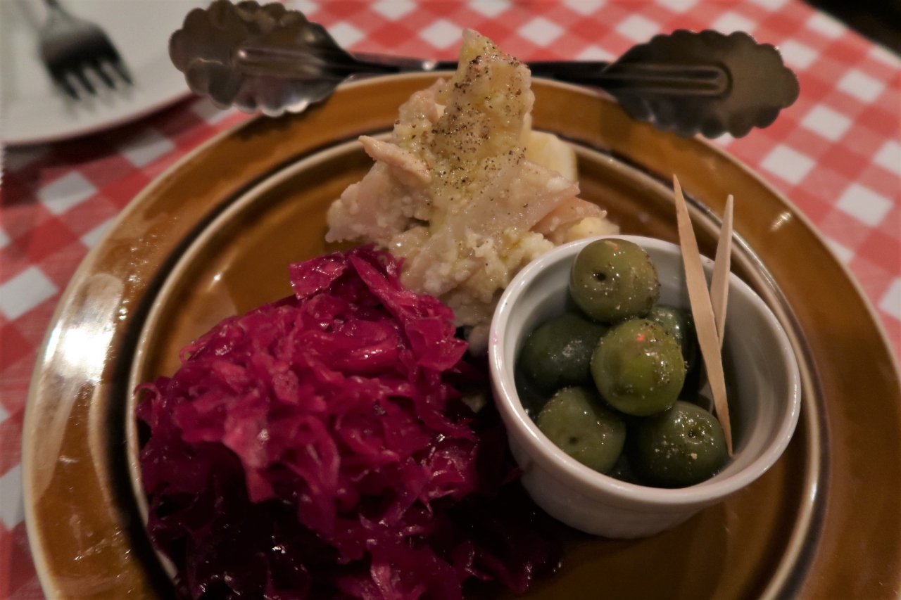 ●前菜3種盛り(赤キャベツとクミンのピクルス、やげんナンコツのアーリオ・オーリオ、厳選オリーブ) 赤キャベツはクミンの風味が新鮮。やげんナンコツの歯ごたえ、オリーブも美味しい。