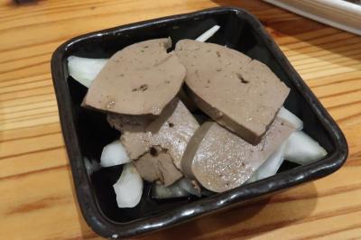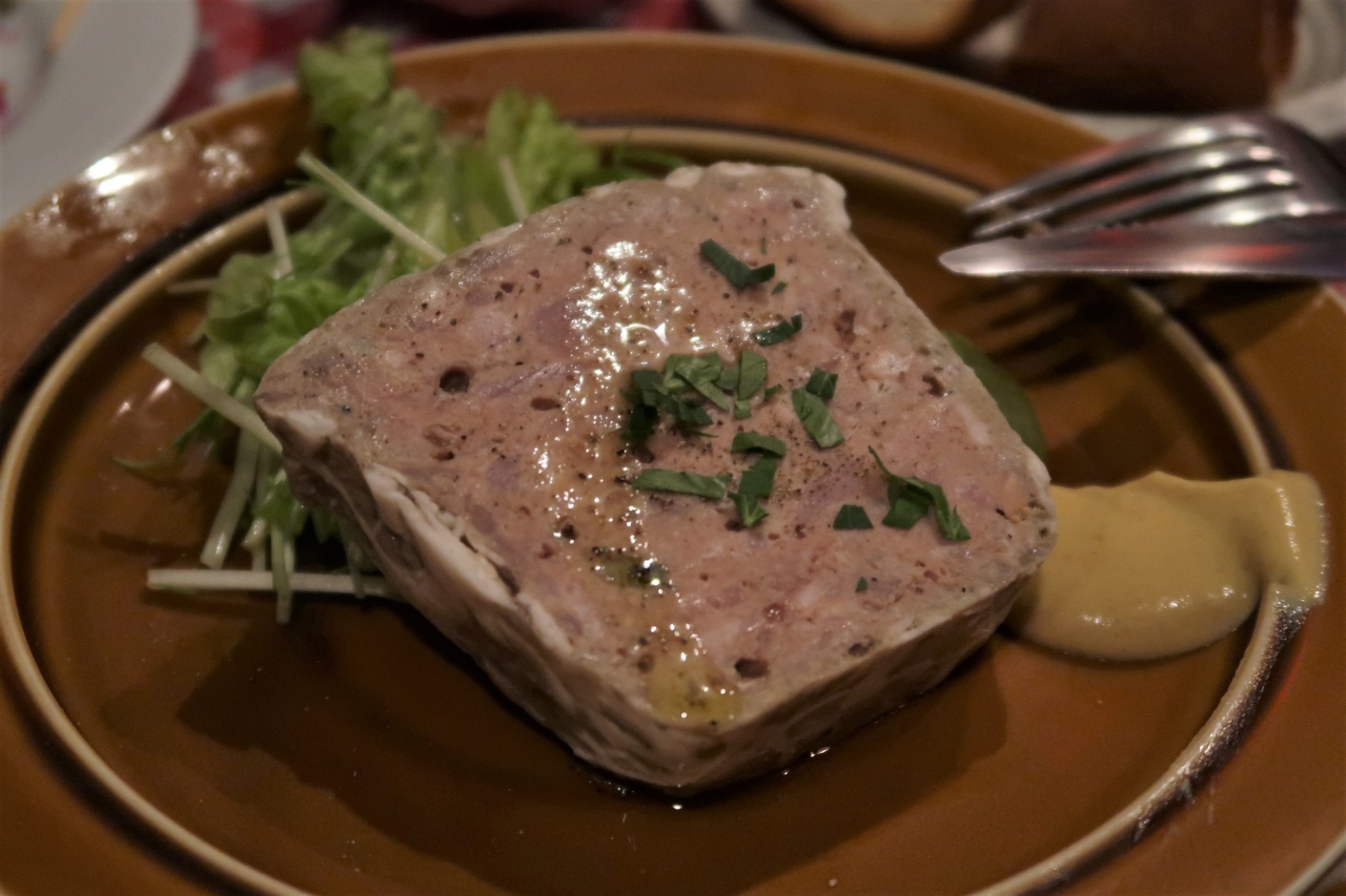 ●ミミガーと木耳の特製煮凝りハム 肉パテ風のものを想像していましたが、厚みがありカマンベールチーズのような大きさ。ミミガーと木耳のコリコリ感、煮凝りの弾力とのコントラストが楽しい。そしてミミガー以外の肉も入っているような。ワインなどのつまみにぴったり。