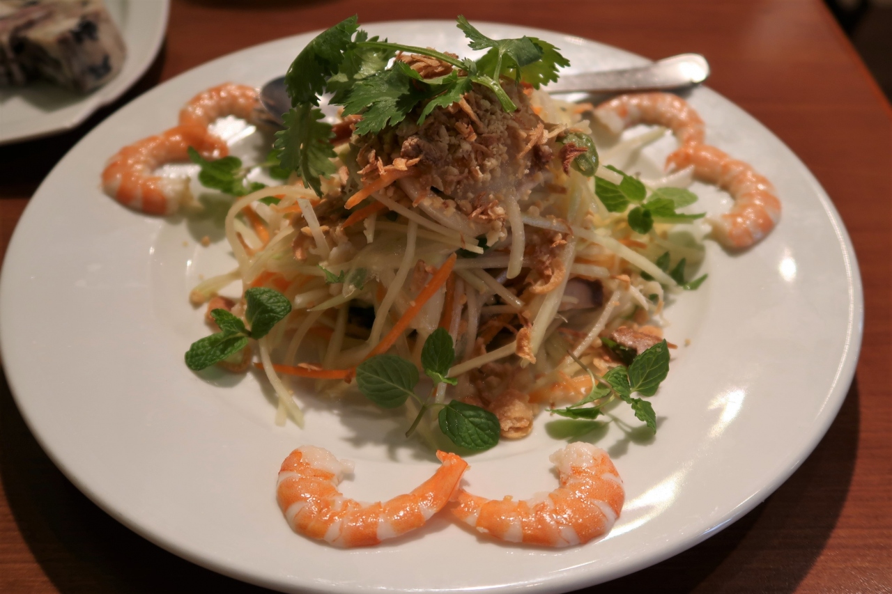 ●豚肉・海老・青パパイヤのサラダ 青パパイヤのシャキシャキ感と干し海老、ナッツの香ばしさが相まりこれは美味しい。そしてミントの香りが新鮮。豚肉(叉焼?)も和えられているので物足りなさもなく、今日1番の美味しさでした。