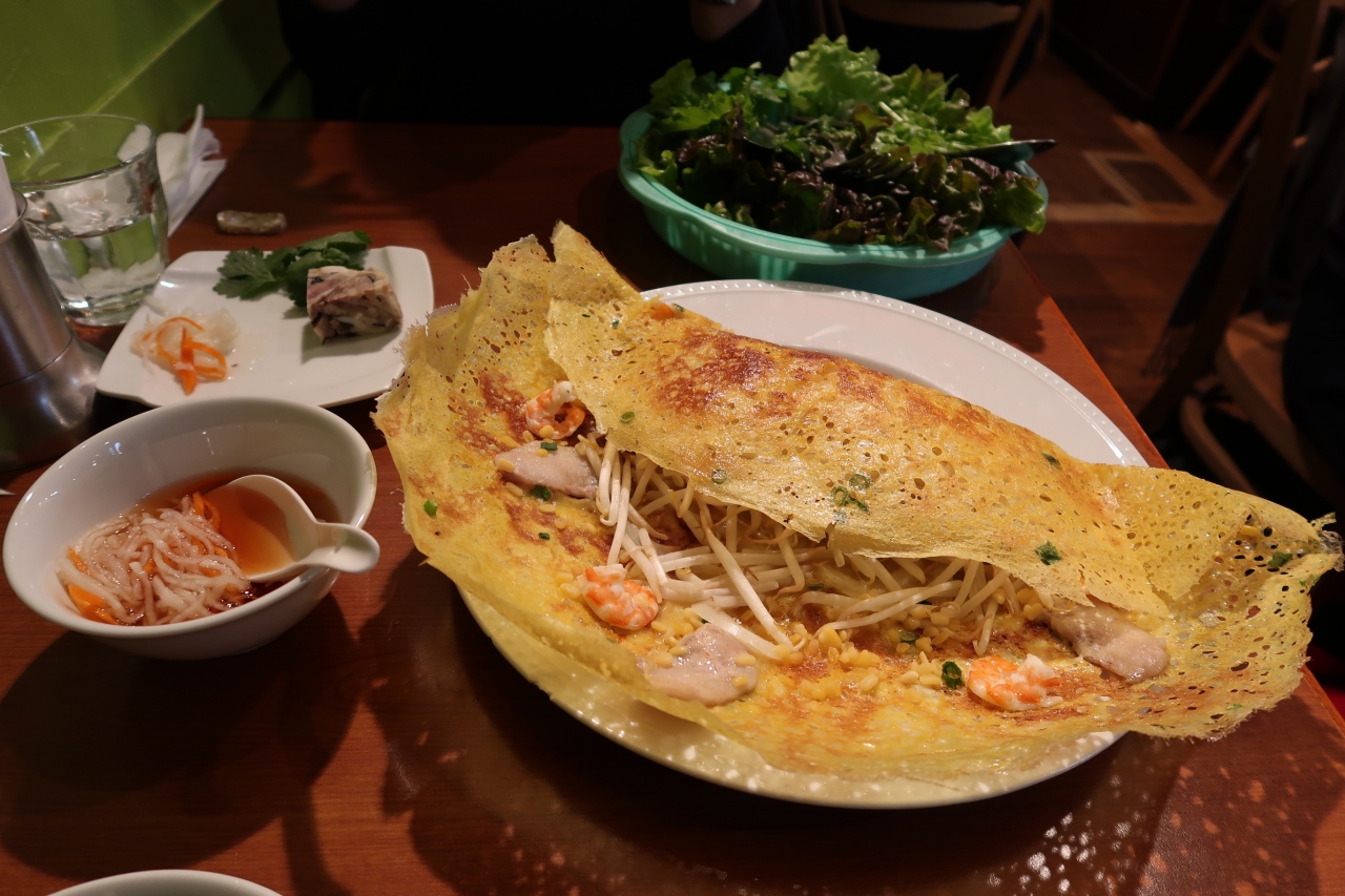 ●バインセオ 葉物はサニーレタス、水菜、大葉、香菜少々。適当な大きさに切り分け、葉野菜にのせ、なます入りのタレをかけ頂きます。味はまずまずだと思いますが、食べ方が下手でポロポロこぼれ結構食べ散らかしました。なので取り皿に順番にのせて食べた方がよかったかも。もやしが多く食べ応えがありました。