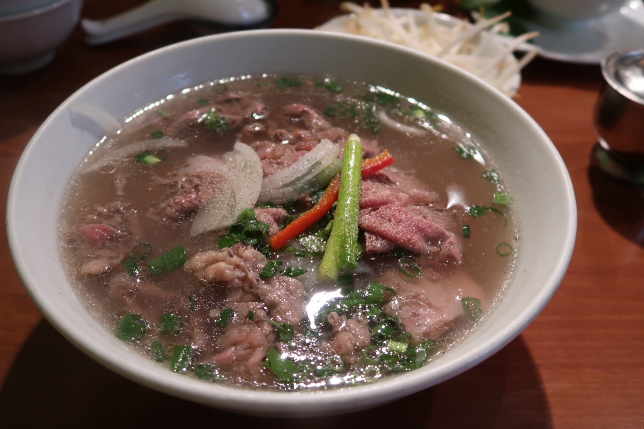 ●牛肉のフォー 薄切りの肉と厚みのあるもも肉(?)が2切れ。ツルツルとしたフォーに美味しいスープが絡みます。ただ塩分は少し高めなので、半分以上は残しました。