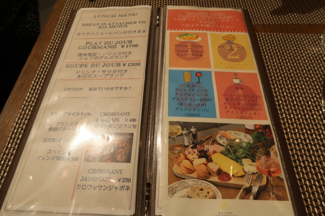 ランチで訪問。お店は飯倉片町の交差点すぐの場所です。日曜の13時着で8割ほどの入り。奥のテーブル席に案内されました。注文したのは2名でシェアのブランチボード。@3700円(税別)。チョイスできるので、オムレツの具はベーコンで、チーズは白カビチーズとウォッシュチーズ、食前のドリンクは+200円で白ワイン(のはずが、1杯分しかなく1杯はロゼに)、食後はコーヒーを。パンは食べ放題になります。