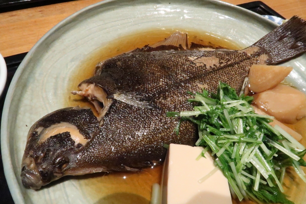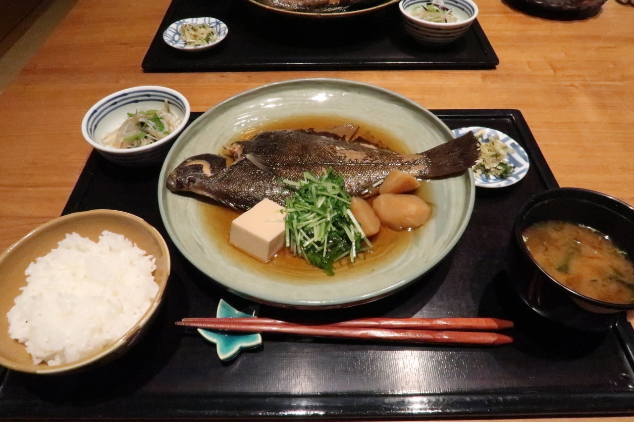 ●真子鰈煮付け定食 淡泊な味わいの鰈の味を消さぬようにあっさりした煮付け。身はふっくらやわらかく旨味たっぷり。小骨も少ないので食べやすく箸が進みます。付け合わせは絹豆腐、水菜、じゃがいも。滑らか、シャキシャキ、ねっとりと食感の違いも飽きさせません。
