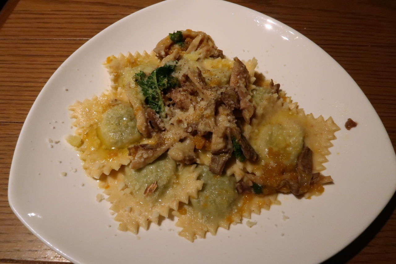 ●サルサヴェルデを詰めた全粒粉のラビオリとランンプレドット サルサヴェルデはイタリアンパセリの風味が弱いように感じましたがこんなものでしょうか。初めて食べるランプレドットはギアラの塩もつ煮込みといった趣。あっさりしており、臭みもなくなかなか美味しい。ただラビオリと合わせて相乗効果があったか今いち分からず。