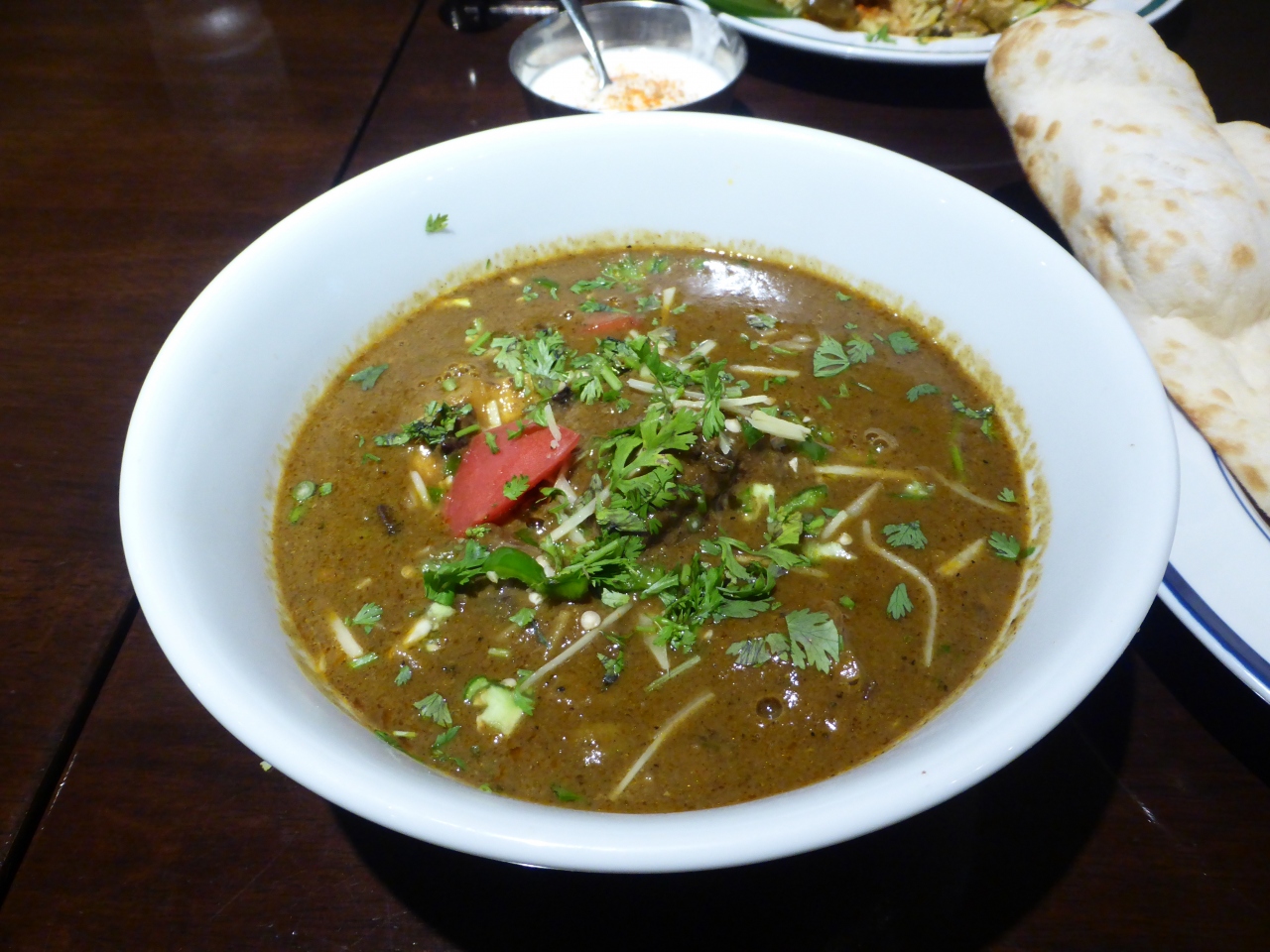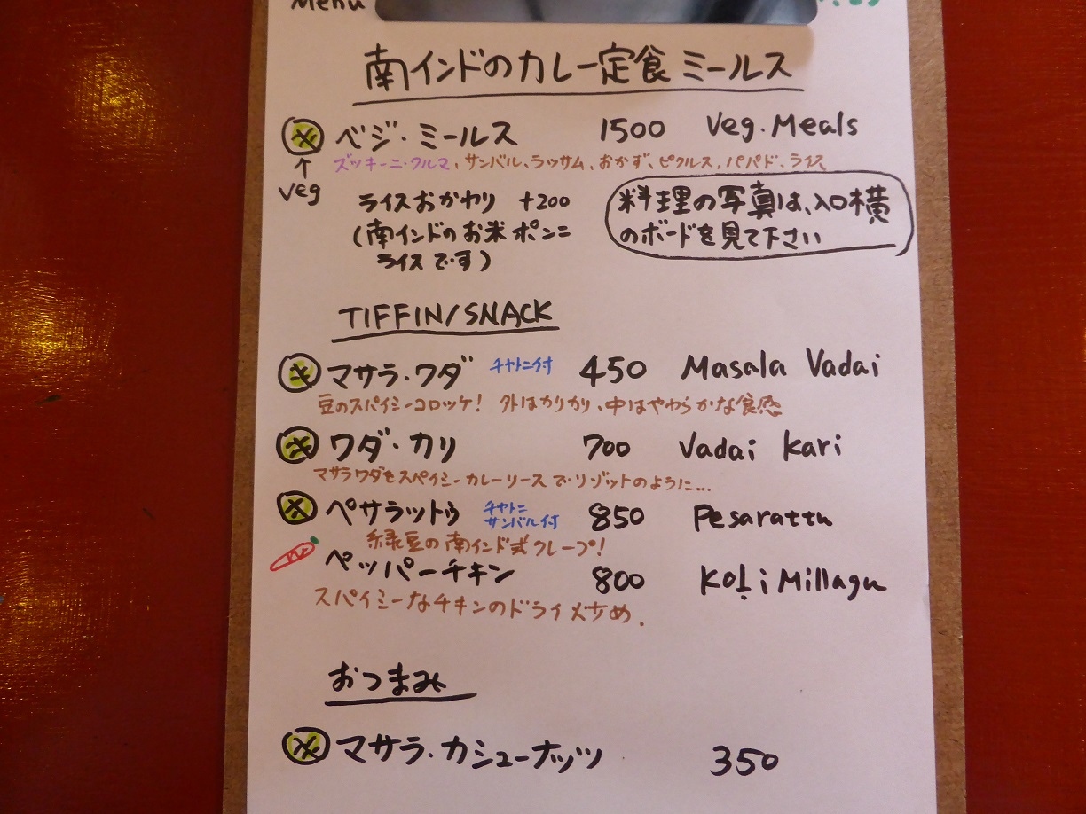 ミールスはズッキーニのクルマ、マイソールのラッサム、パプリカのサンバル、ヨーグルトのパチャディ、ポリヤルは人参、隠元、キャベツの3種。これに南インドのライス、パパドゥ、ピクルスが付きます。ラッサム、サンバルも他のインドカレー屋のものとは全く違います。ズッキーニのクルマを含め、やさしい味わいでスパイスや辛味が尖っていなくて、野菜の旨さを引き出しています。非常にバランスがよくおいしいです。しかもポリヤルがどれも旨い。塩加減も丁度良く、ココナッツファインが野菜をよりおいしく感じさせてくれます。見た目は少ないように見えますが、全部食べるとお腹一杯になり大満足。