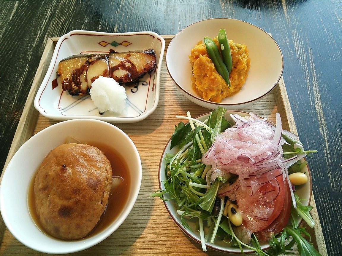 プチランチのメインデリはベジミートローフで、サラダ、有機玄米ご飯、スープがセット。ベジミートローフは所謂大豆たんぱくだけではなく、いくつかの野菜も混ざっているので味わいも複雑で歯ごたえもあり、物足りなさは感じませんでした。スープは野菜の甘みが良く出たやさしい味でおいしいです。フィッシュプレートの魚はイトヨリダイのソテー。これにアカメという海藻と牛蒡人参の金平、ひよこ豆の煮込み、サラダ、酵素玄米、スープです。イトヨリダイはソースとのバランスも良く、アカメは黒く薄いもので、噛んでいると確かに海藻の味わいがします。ひよこ豆は歯ごたえもあり食感も楽しめます。酵素玄米は初めて食べましたが、もちもち感があり滋味深いです。