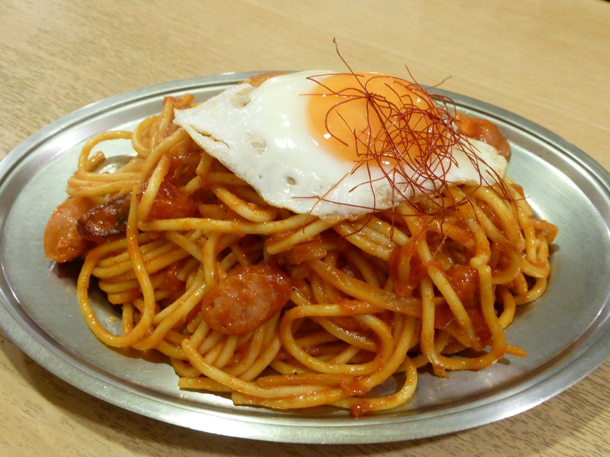 週末のランチで訪問。入口にある食券を購入し、ナポリタン野菜多めとナポリタンの旨辛、目玉焼きトッピングを注文。麺は両方並盛です。ナポリタンは野菜多めという事でしたが、自分達の感覚ではこれぐらいで普通のように思いました。逆に旨辛の方の野菜が少なく感じ、ほぼ麺のみを食べている印象。食べ始めて感じたのは、今のナポリタンは旨いんだなぁという事。しかし、それも1/3まで。しっかり味(塩分高め)なので中盤からは少しくどく感じ始め、最後は無理やり食べきりました。少し多いとの注意書きはありましたが、麺がアルデンテではなく、かなり水分を含みもちもちしていたので、早く満腹感を感じ始めたと思います。旨辛はにんにくと辛めのスパイスが入っておりナポリタンと呼ぶにはどうかなぁという味わいでした。