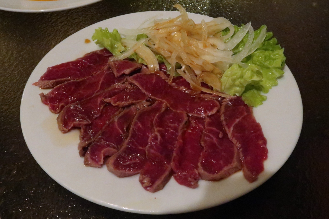 ●ひつじのレアステーキ(Sサイズ) たたき風の薄切りステーキ。臭みもなくしっとりとした肉はやわらかで適度な噛み応え。しっかりとした旨味も感じられ、レアでもこんなに美味しいのかと驚き。