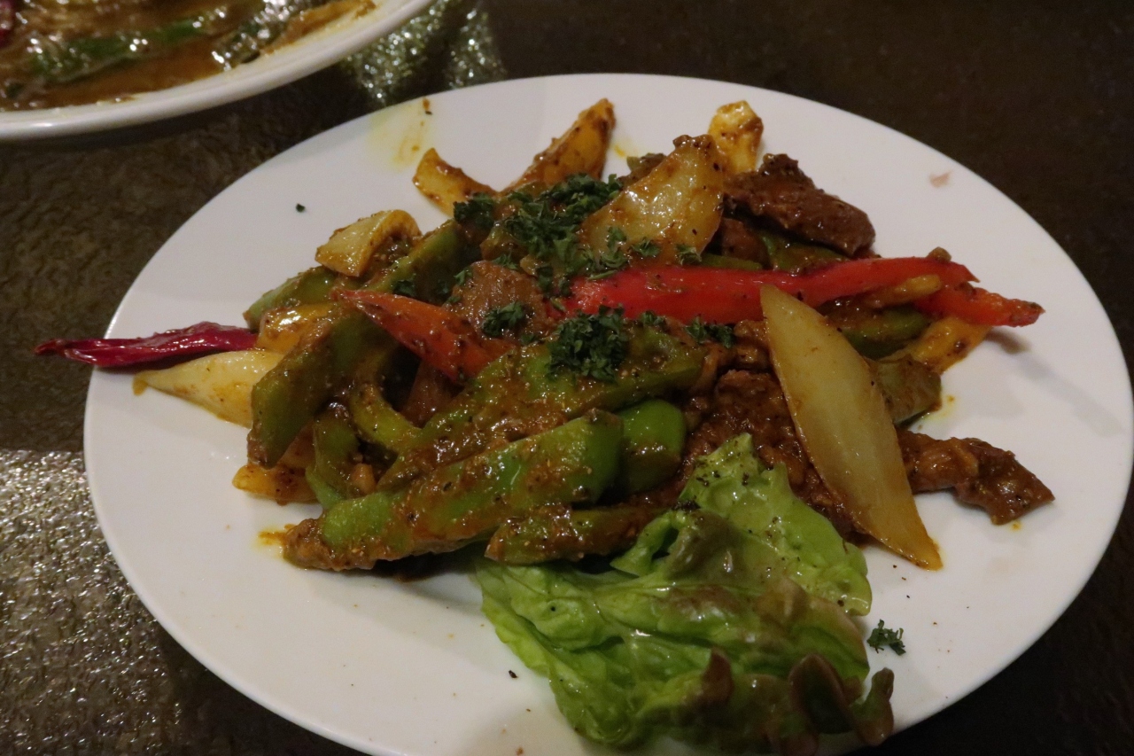 ●ケッタス・ブジャ サボテンと羊肉のインド風炒め物。皮は少し歯ごたえがあり、それ自体にあまり味は感じませんが、ほんのり辛めのスパイスが全体を纏めています。