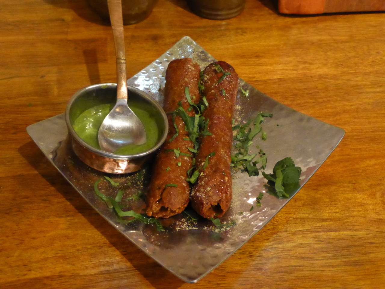 ディナーで訪問。人気店ですので1週間ほど前に電話で予約しました。入店するとすでに満席でカウンター席に案内されました。注文したのはワラ春巻き、シークカバブ、カレーはザクチキン&ポークチリキーマをナンで、ラムブラックペッパー&オイスターマラバーリをライスで。