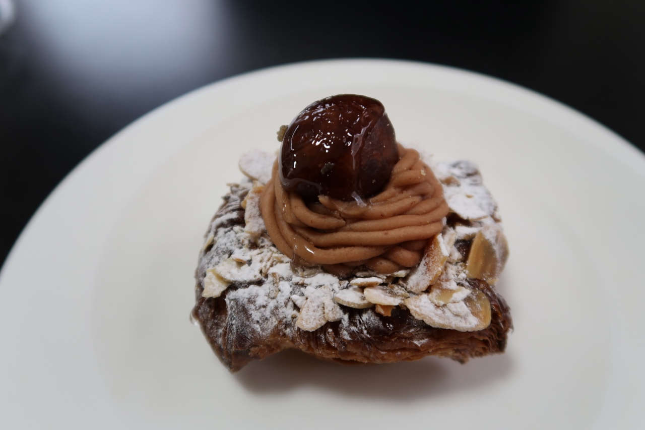 ●渋皮栗デニュッシュ 栗の渋皮煮が苦み、甘み、コクが抜群で圧倒的に旨い。濃厚なマロンクリームもぎっしり。これにスライスアーモンドとデニュッシュのサクサク感のコラボがいい。