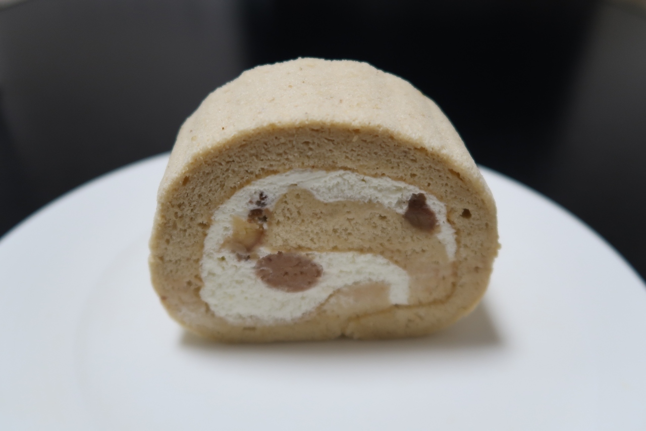 ●マロンシフォンロール 3つの栗味が楽しい。生地はペーストが練り込まれほんのり。生クリームの中の中心のマロンクリームは濃厚。クラッシュした栗も散らされ、栗本来の風味、食感の変化もありました。