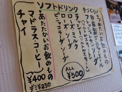 店構えははっきり言って怪しいです。近所にあっても雑誌で紹介されていなければ、まず入らないでしょうね。週末の1時過ぎでお客はいませんでした。店内にも手作りと思えるような装飾やオブジェが多数あり、独特の雰囲気です。メニューは定食のミールスが1種類なので、ミールスと飲み物をジンジャエールとラッシー(スイート)を注文。