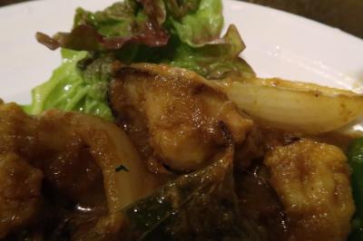 ●牡蠣マハラジャ炒め(+ナン別注) 牡蠣、カリフラワー、茄子、ピーマンのスパイス炒め。牡蠣の旨味とスパイスが見事なハーモニー。残ったソースをナンにつけ食べるとこれが絶品。さながら牡蠣カレーを食べているようでした。