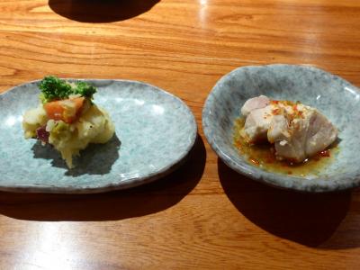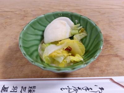●酢重おばんざい4種盛り合わせ 銀たら以外のおばんざいは水菜とトマトのサラダ、南瓜味噌煮、がんもと大根の煮物。それぞれおいしいのですが、がんもも味噌仕立てで南瓜、銀たらもそれぞれ味わいは異なりますが味噌なので、後半少々くどく感じ酢の物が欲しくなりました。