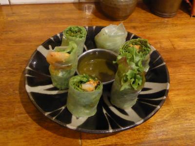 ●ワラ春巻き エビやパクチーが入った生春巻きでおつまみにはちょうどいい。