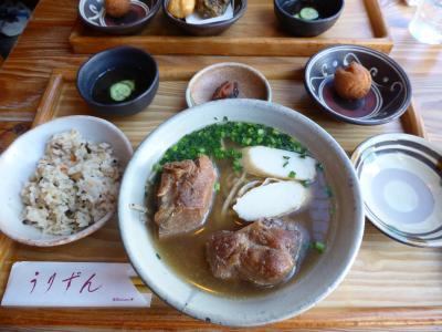ソーキそばのスペアリブは肉がたっぷり付いたもの。かなり食べ応えがありました。出汁に豚の旨味もたっぷり出ていて美味。ただ麺は皮まで引いた粉で打った蕎麦のようで、以前沖縄で食べたそばはもっと中華麺に近いものだったので印象が違いました。