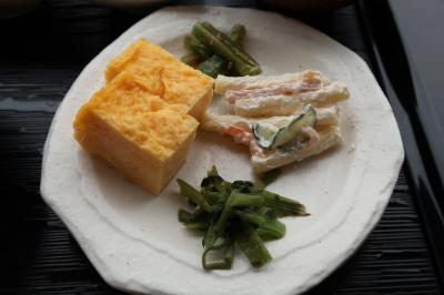 ●おかず 手羽大根 ピリ辛コンニャク マカロニサラダ 茄子煮びたし 漬けまぐろ 卵焼き 山くらげ 沢庵 かっぱ漬け 葉山葵漬け