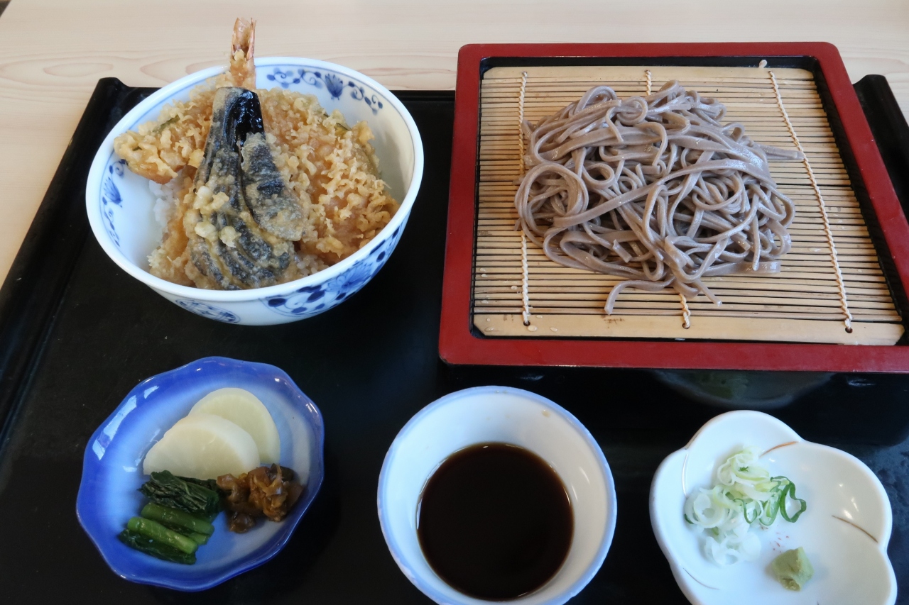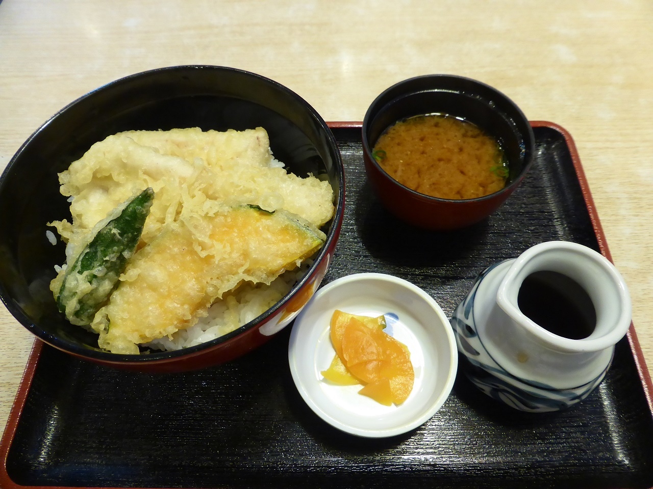 ほうとうは南瓜が意外と少なく、里芋、大根、人参、白菜、椎茸、山菜など盛り沢山。野菜は別々に下茹でされているのか、汁が南瓜味になっていないのは好印象。ただ大根、人参は茹ですぎてフニャフニャなのは頂けない。味はまずまずでした。天重ランチの天丼は茄子、南瓜、エビ1本。こういう店なので蕎麦は…。味については特に無し。