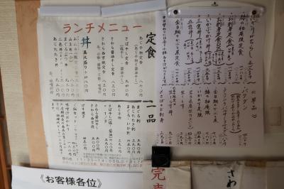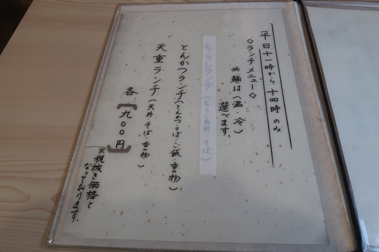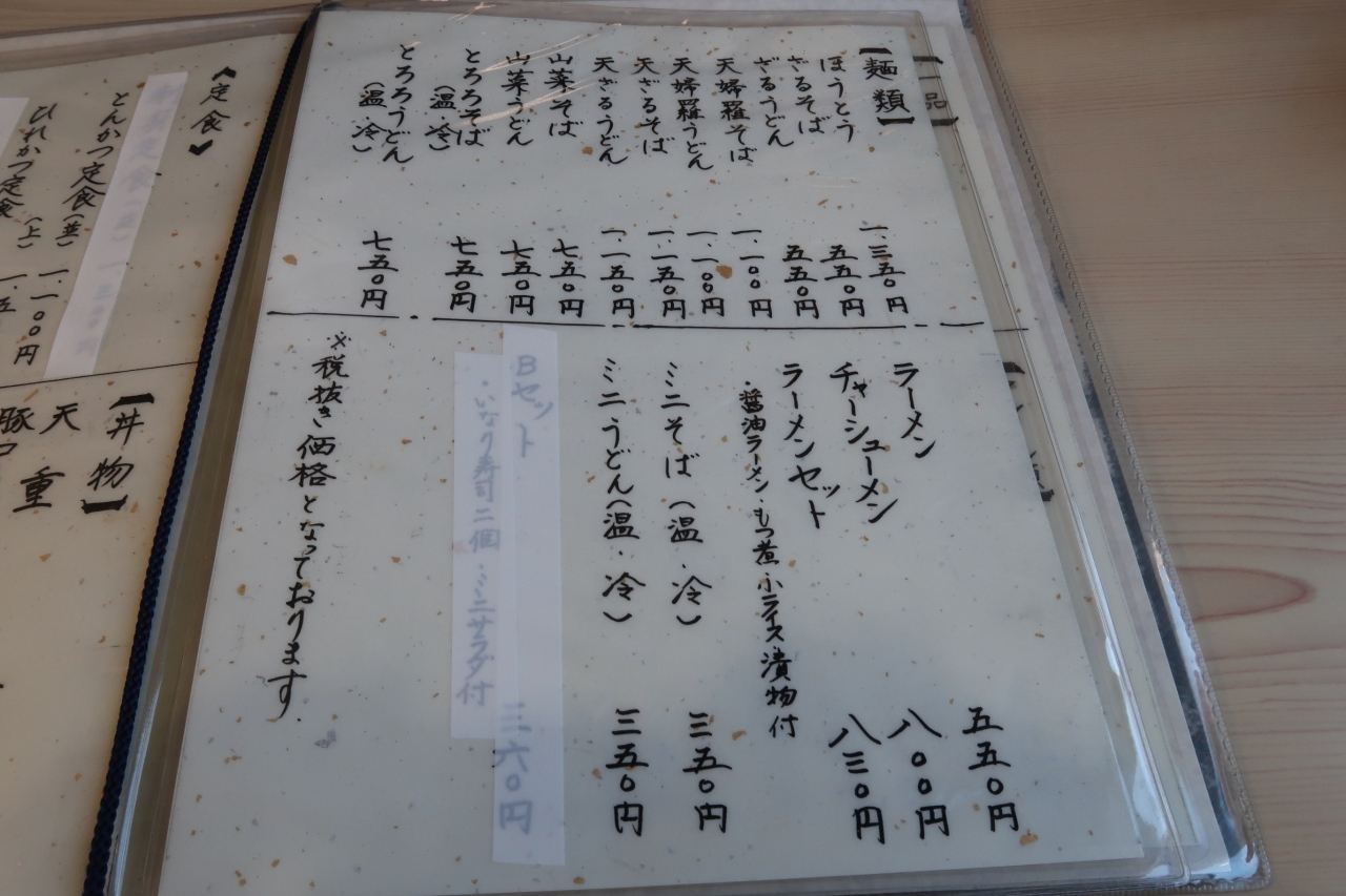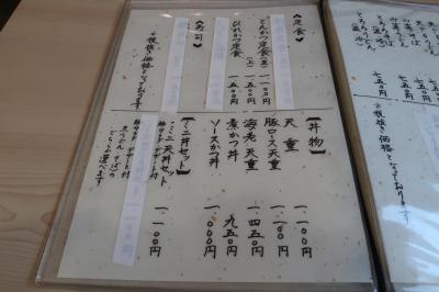 船山温泉旅行1日目のランチで訪問。身延駅前に何軒か飲食店があり、店頭のメニューを見て決めました。コロナの影響で少しメニューを減らして営業しているそうです。注文したのは、ほうとうと天重ランチ。