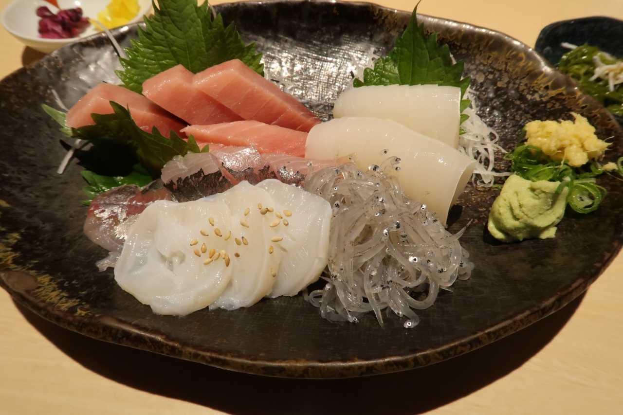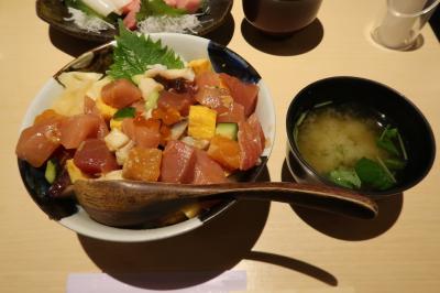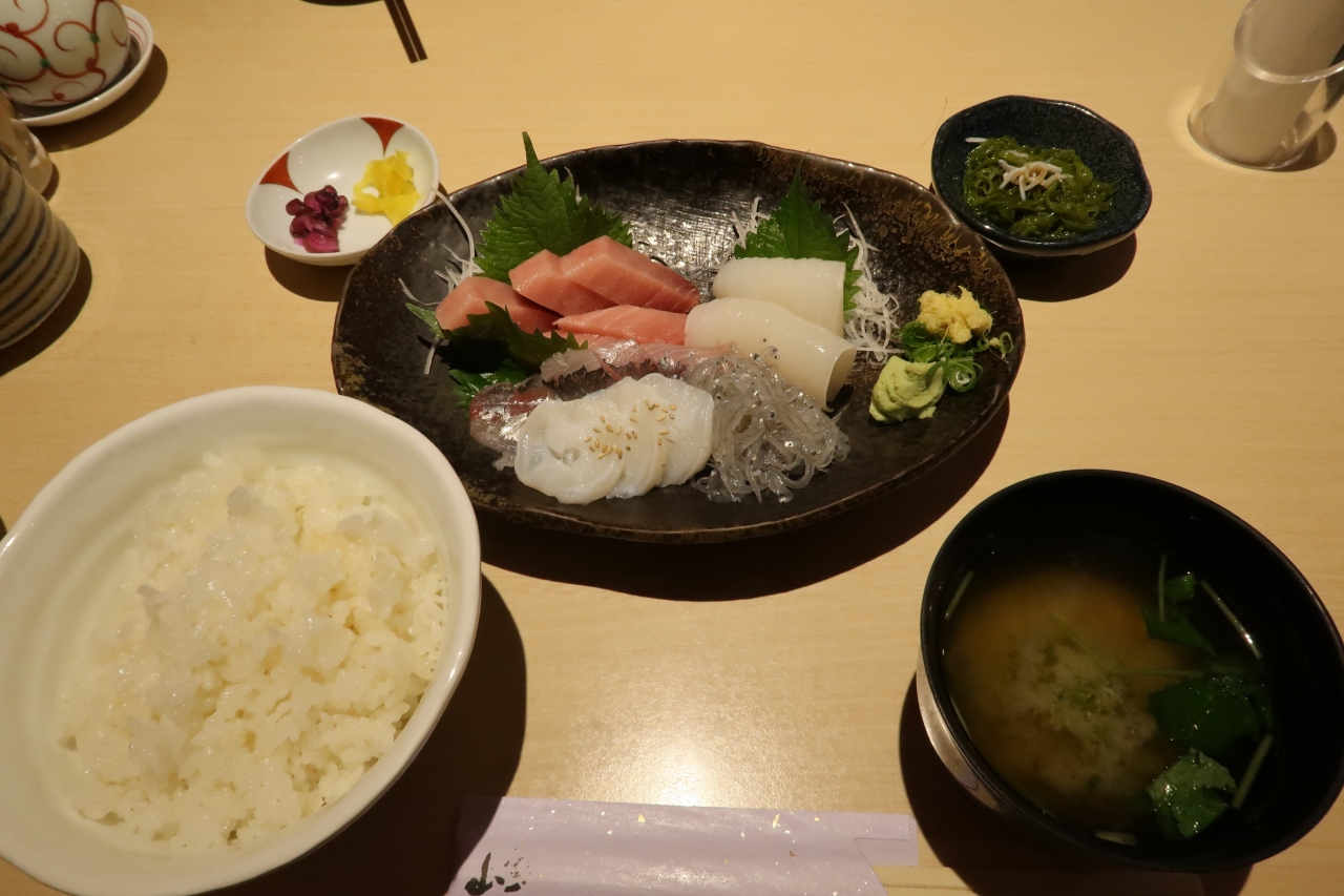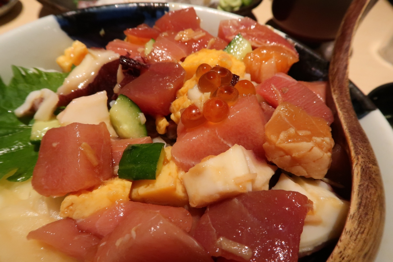 山正丼の具材は鮪、中トロ、蛸、サーモン、イクラ、きゅうり、卵など。すでにタレと絡めてあり口に運ぶと、それぞれの旨味と蛸、きゅうりの歯ごたえも相まって楽しい。そして中トロと思しき部位は脂の乗りも良くとろけます。食べ応えもあり満足度の高い丼でした。お刺身定食DXは鮪、イカ、鰺、生しらす、生蛸。もずく、漬物、味噌汁がセット。刺身は新鮮で、蛸はしっかりした食感で噛むほどに旨味を感じます。生しらすは生姜で。鮮度の良さとプチプチ感がいい。鮪は中トロの部位で、ねっとりとした身には脂も乗り、甘み、旨味が溢れます。これはかなりお値打ちの定食でした。