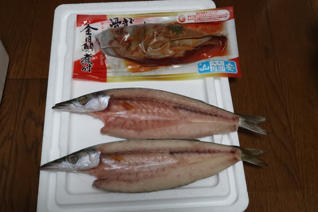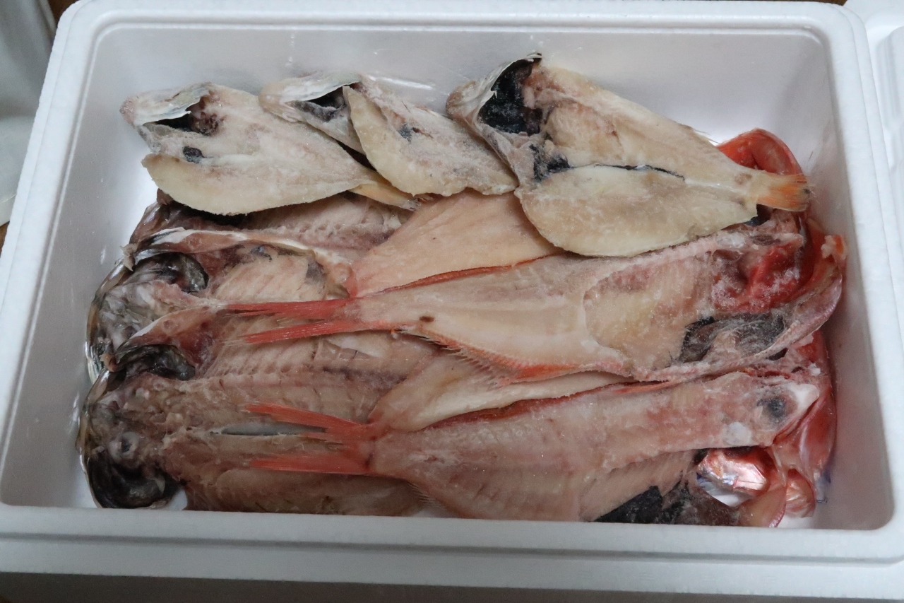 北条セットは真あじ4枚、金目鯛2枚、赤むつ(のどぐろ)3枚、かます2枚、金目鯛の煮付け1尾です、