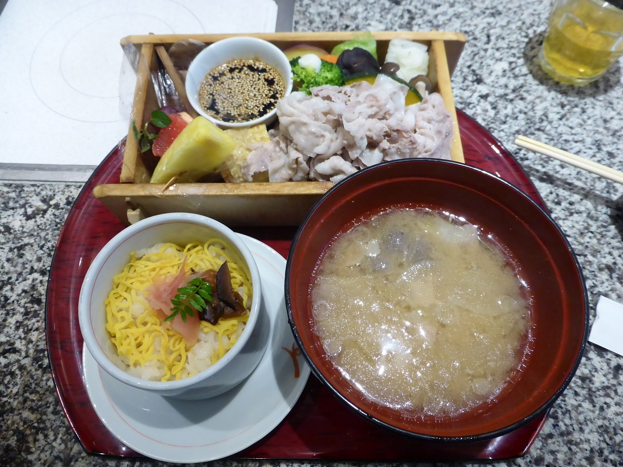 野菜蒸しセットは薄切りの黒豚に野菜各種と卵焼き、果物。豚肉の下にはもやしとマロニーちゃんがたっぷり。つけダレは甘め。黒豚が極薄切りで口溶けも良く脂の甘みを感じます。豚汁は少し甘めの味噌に黒豚のコクがプラス。山椒が入り味を引き締め、いいアクセント。これは旨いです。