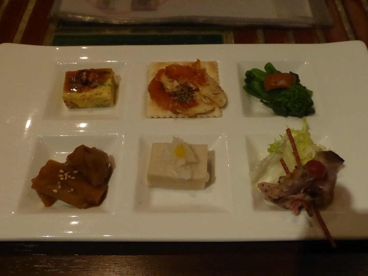 ●おかず盛り合わせ(稚鮎(?)南蛮漬け、コンニャク、自家製叉焼、小松菜お浸し、蕨、白菜もみ漬け)