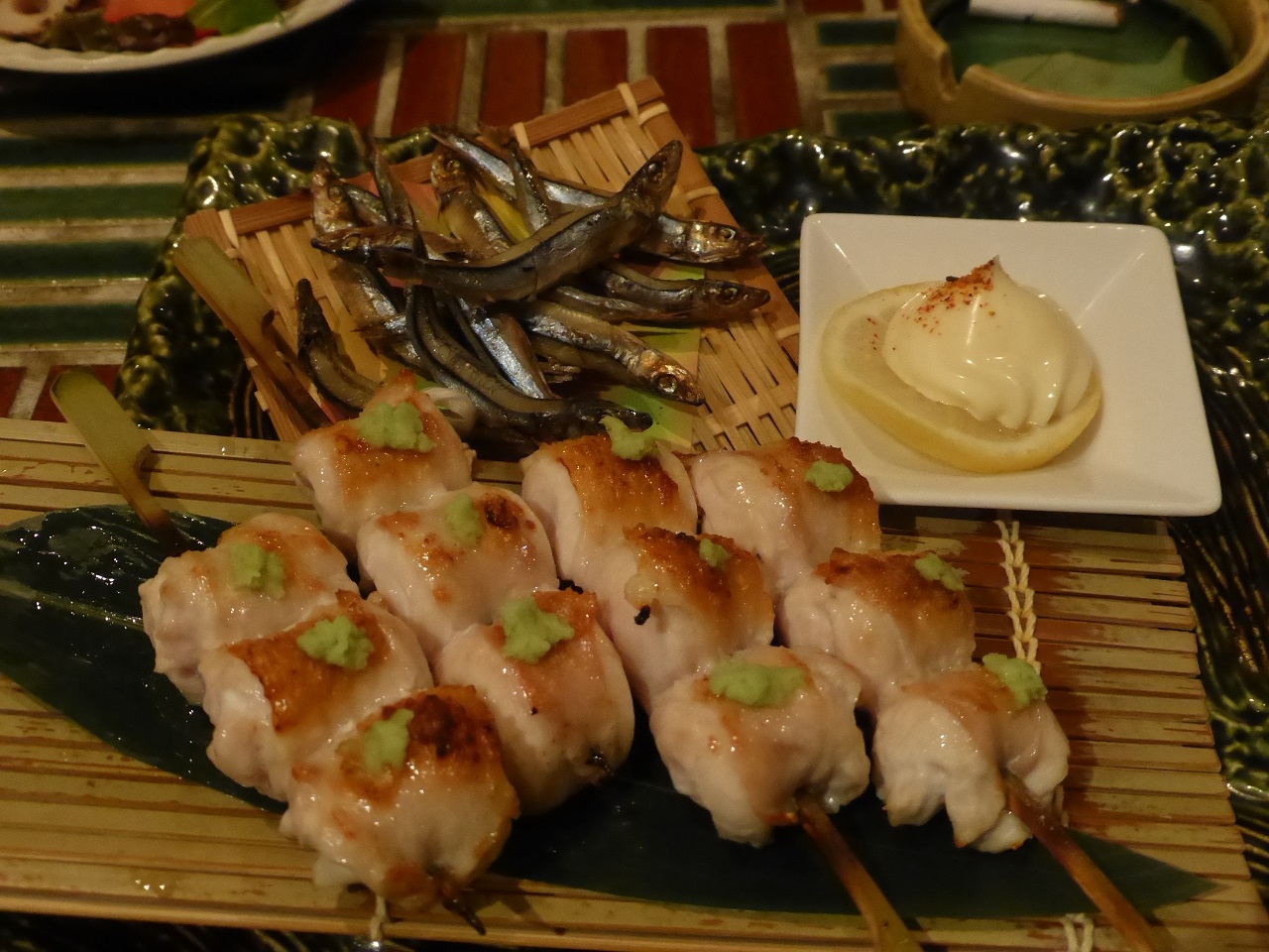 焼物 甲斐信玄鶏の串焼き1本とキビナゴ一夜干し
