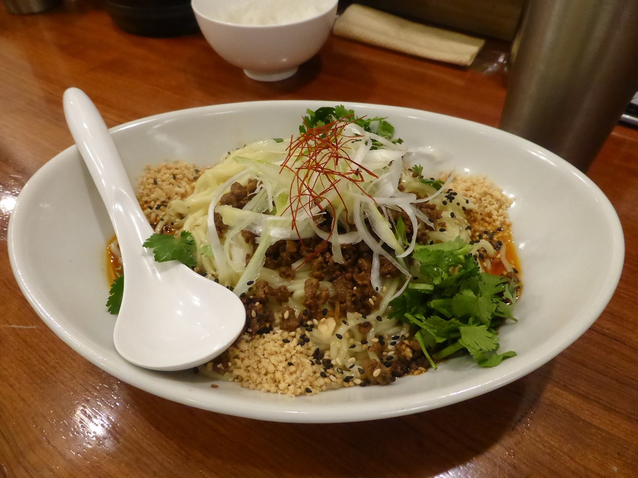 ●汁なし坦々麺 肉味噌にナッツ、胡麻、パクチー、長葱、糸唐辛子がきれいに盛り付けられています。良く混ぜてから口に運ぶとタレと肉味噌の旨みを感じ、後から花椒の痺れが襲ってきます。麻婆麺よりこちらの方が強く感じました。混然一体とした味は洗練されており、非常に美味しかったです。