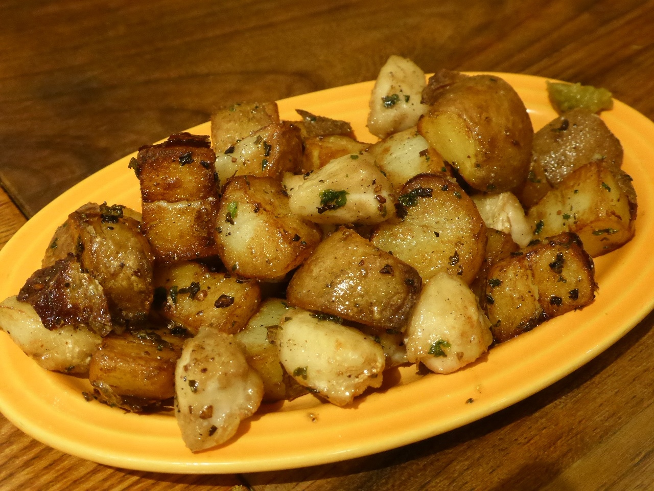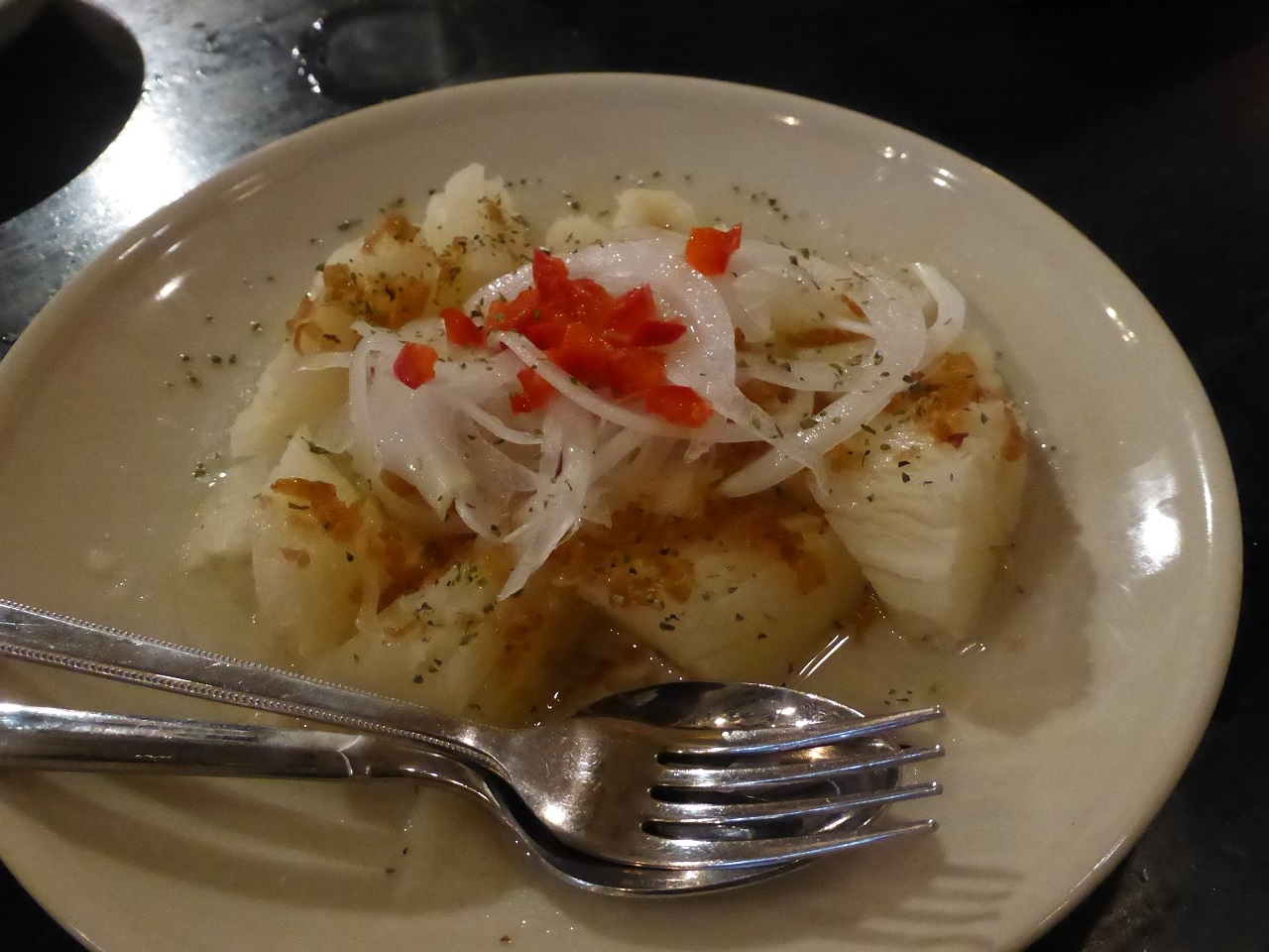 ●キャッサバ芋のガーリックソース ガーリックの香りが食欲をそそります。芋に似た食感ですが、非常にやわらかく口に運ぶとほろほろと崩れます。