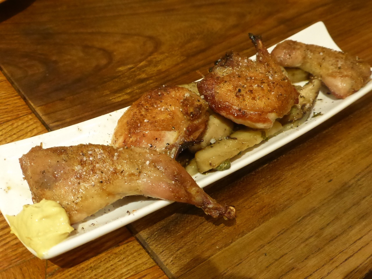 ディナーで訪問。4日前に電話し17時から(18時50分まで)なら椅子席があるというので予約しました。開店と同時に入店しカウンター席に案内されました。注文したのはワインはクロラソレヤ・ブリュットナチュレ。料理は季節野菜のフリット、うさぎと鴨の温製パテ、牡蠣ソテー、ぼんじりポテト、ちょいとクレソン、まるごと鶉(うずら)のロースト。