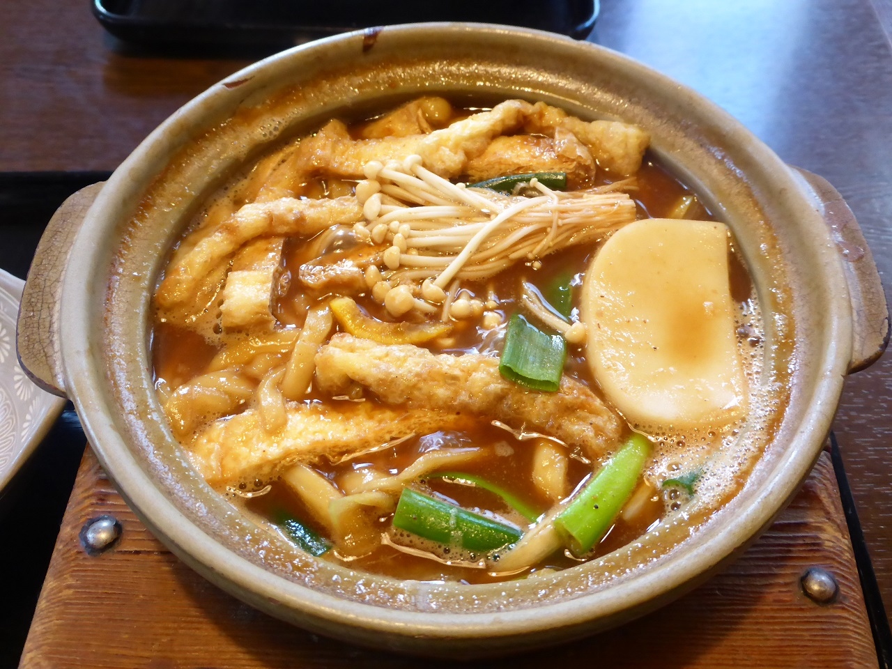 味噌煮込みうどんには鶏肉、油揚げ、蒲鉾、青葱、えのき茸が盛り付けされています。提供されると、グツグツ湯気が立ち昇り、味噌のいい香りが漂います。麺は細めながらちょうど良いコシ、噛み応えもありおいしいです。甘みとコクがある八丁味噌の絡みもいい。あまり味噌が濃いと途中で飽きてくるのですが、これは出汁の割合も良く、最後まで頂けました。