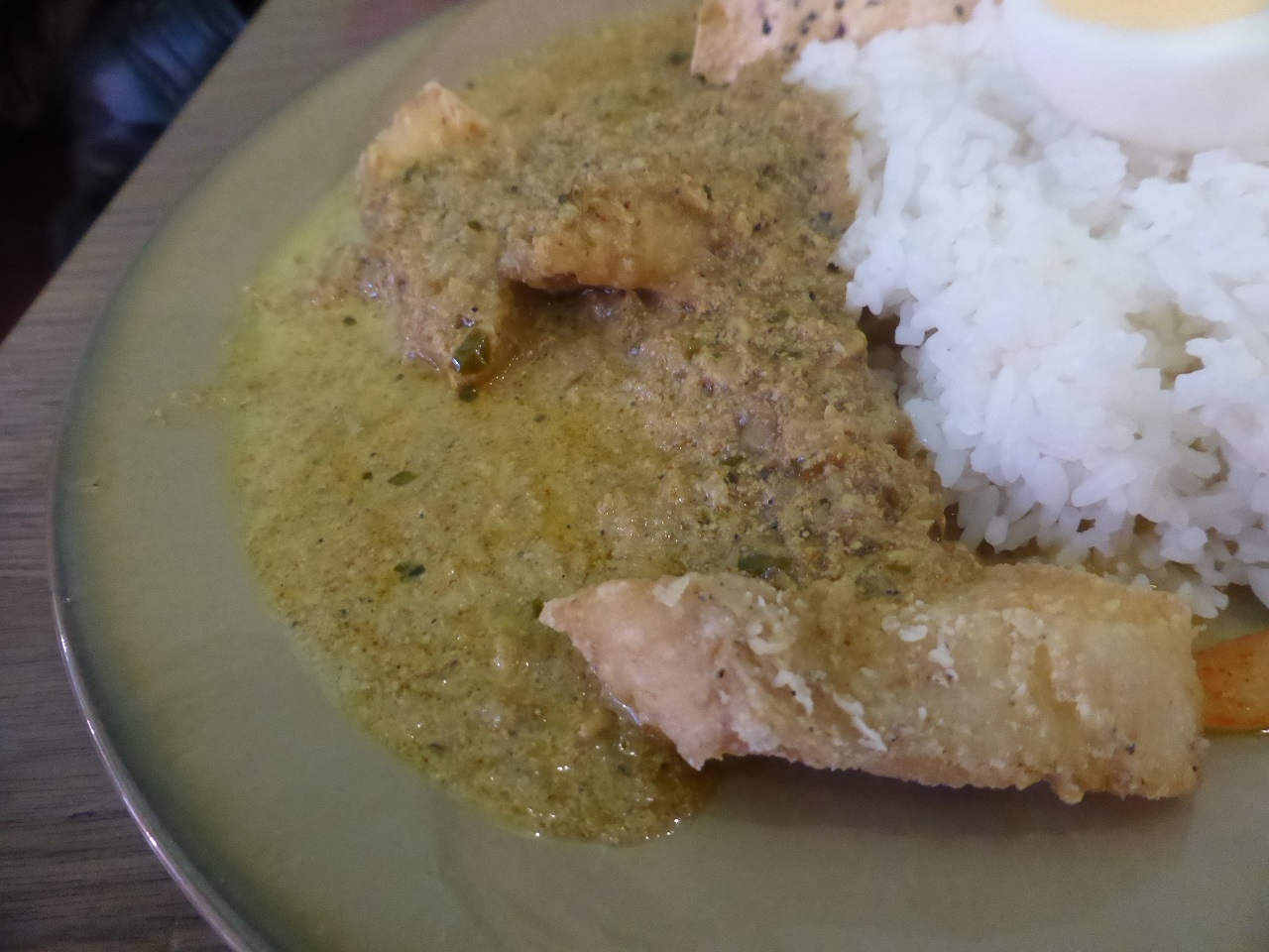 ●白身魚のカレーは生クリームが使われておりマイルド。しかし奥にはしっかりとスパイスを感じリッチな味わい。白身魚はカレイでしょうか。煮込まれたものではなく揚げてあるので、衣はカリっと香ばしく食感の変化もあり旨いです。