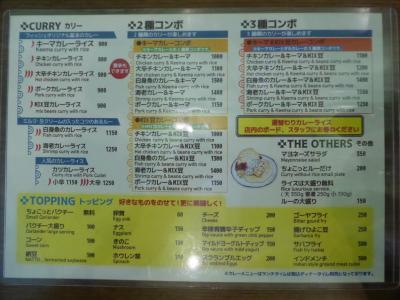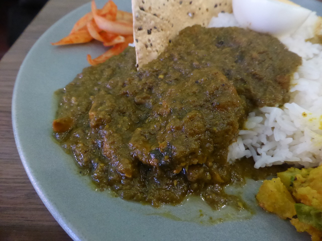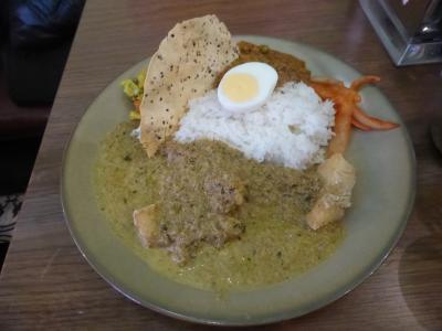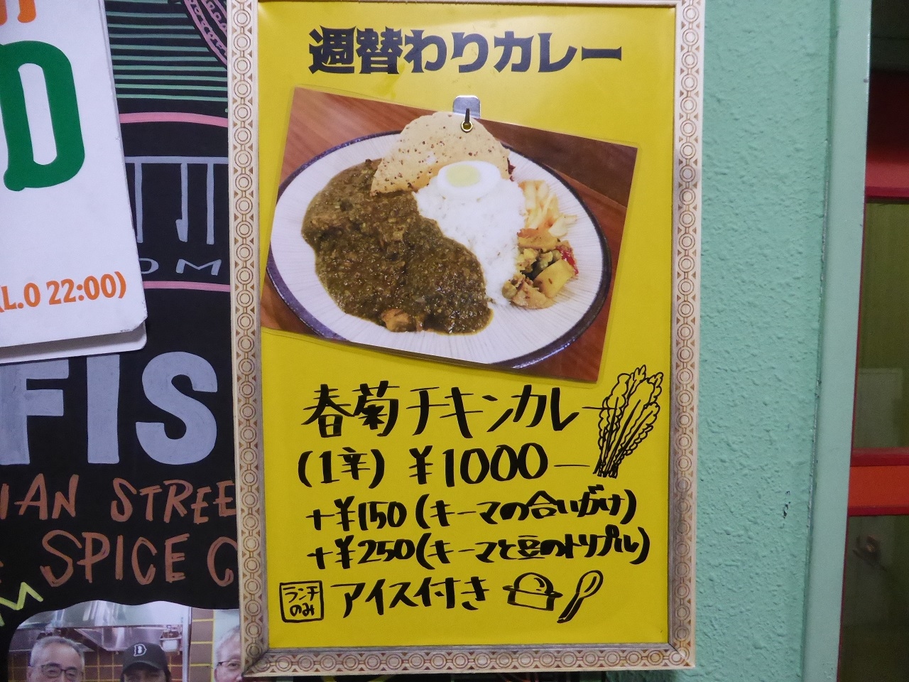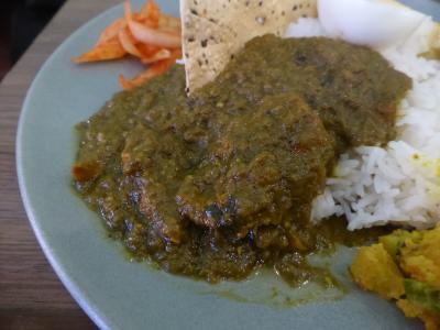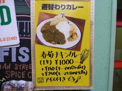 ●春菊チキンカレー 鍋で食べるような春菊の味はせず、かと言ってほうれん草とは違うコクのある味わい。これは言われないと分からないですね。大振りの鶏肉は食べ応え十分。そしてカレーはトリガラか何かで出汁を取ったかのようなしっかりした旨味を感じます。そしてその旨味とスパイスが見事に融合し深い味わい。これはおいしかったです。