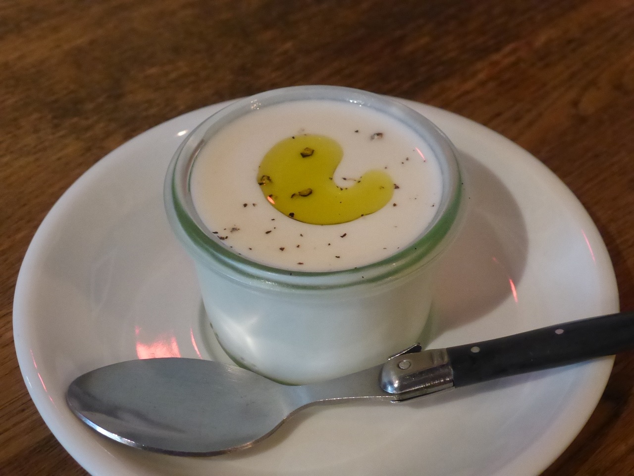 ●スープ 蕪とカリフラワーのポタージュ。雑味が全くなく口当りがまろやか。塩分控えめでやさしい味わいにも拘らず、蕪とカリフラワーの味はしっかり感じます。黒胡椒がいいアクセント。オリーブオイルで香りとコクが増し美味。