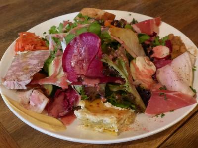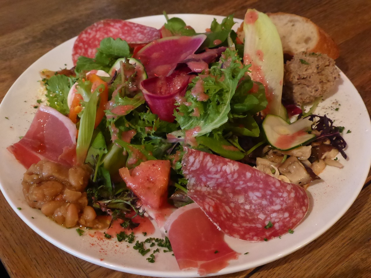 ランチで訪問。12時過ぎに入店すると奥のテーブル席に案内されました。注文したのはたっぷり野菜プレート+お肉前菜を3種類おまかせで。野菜プレートにはレタス、トマトなどの他、安納芋のグラタン、キャロットラペ、白いんげん豆の煮込み、きのこのマリネも盛り付けられています。お肉の前菜は2皿分で燻製生ハム、パテ・ド・カンパーニュ、自家製ベーコン、サラミ、リエット。